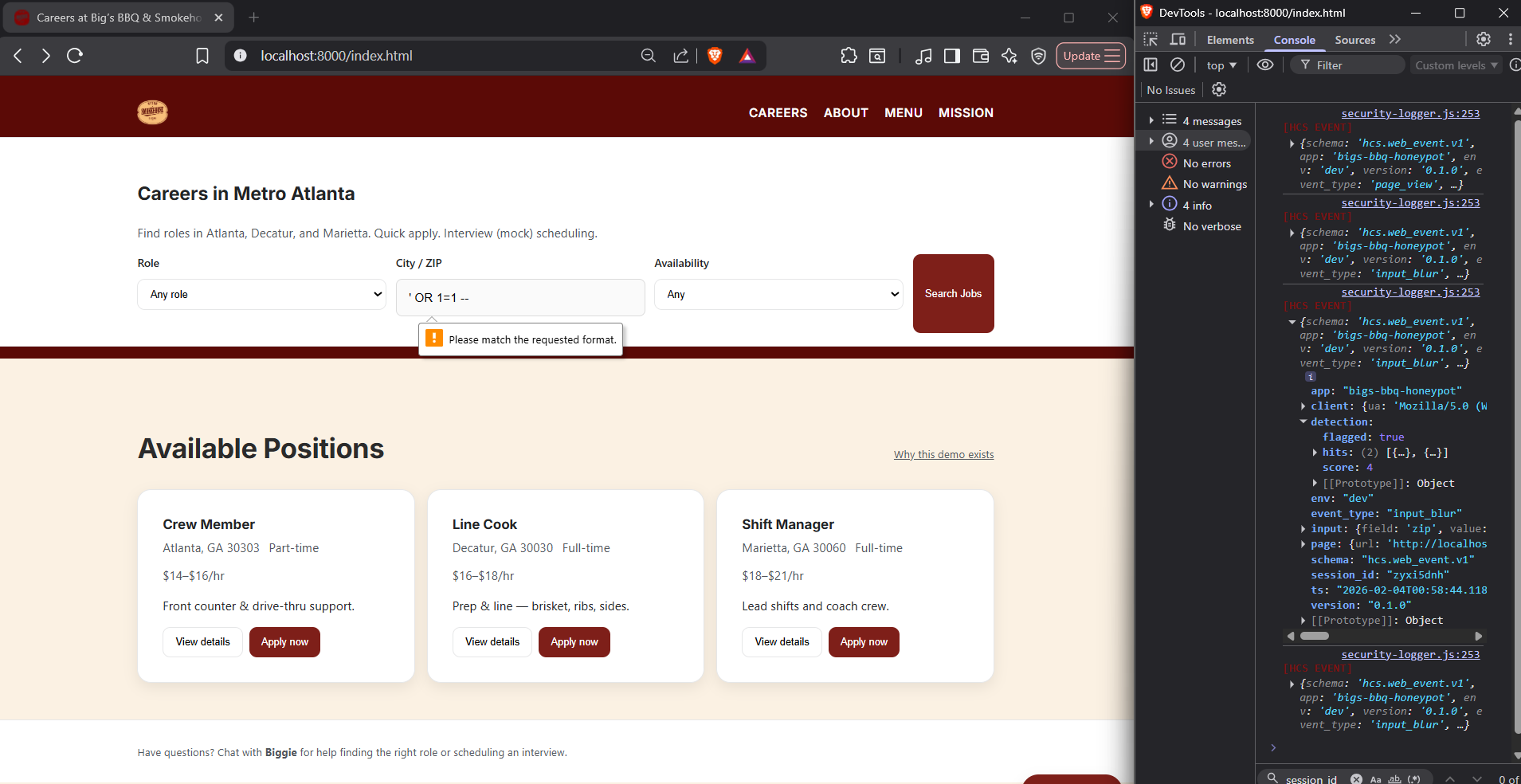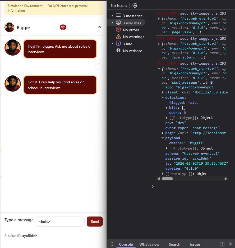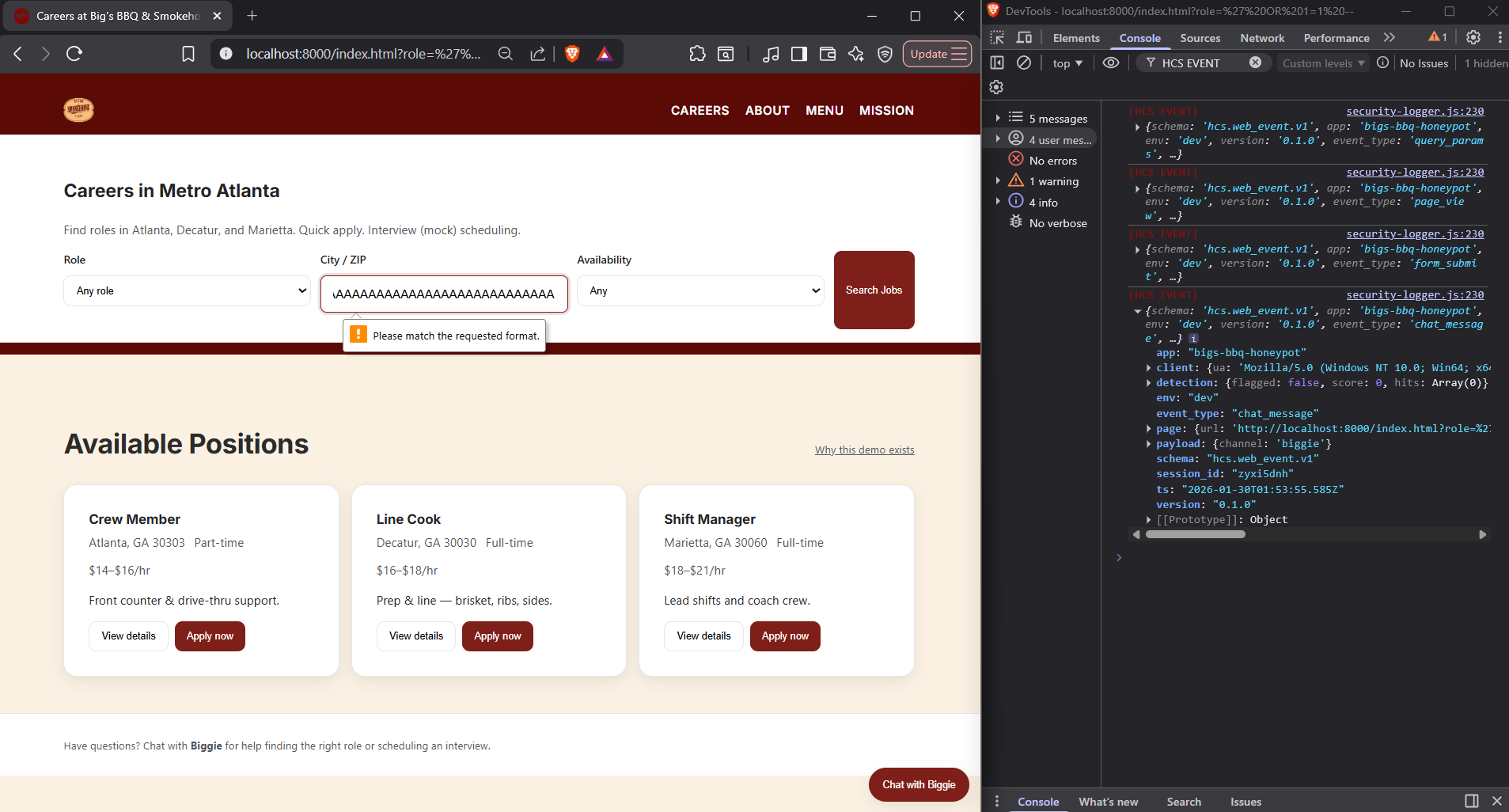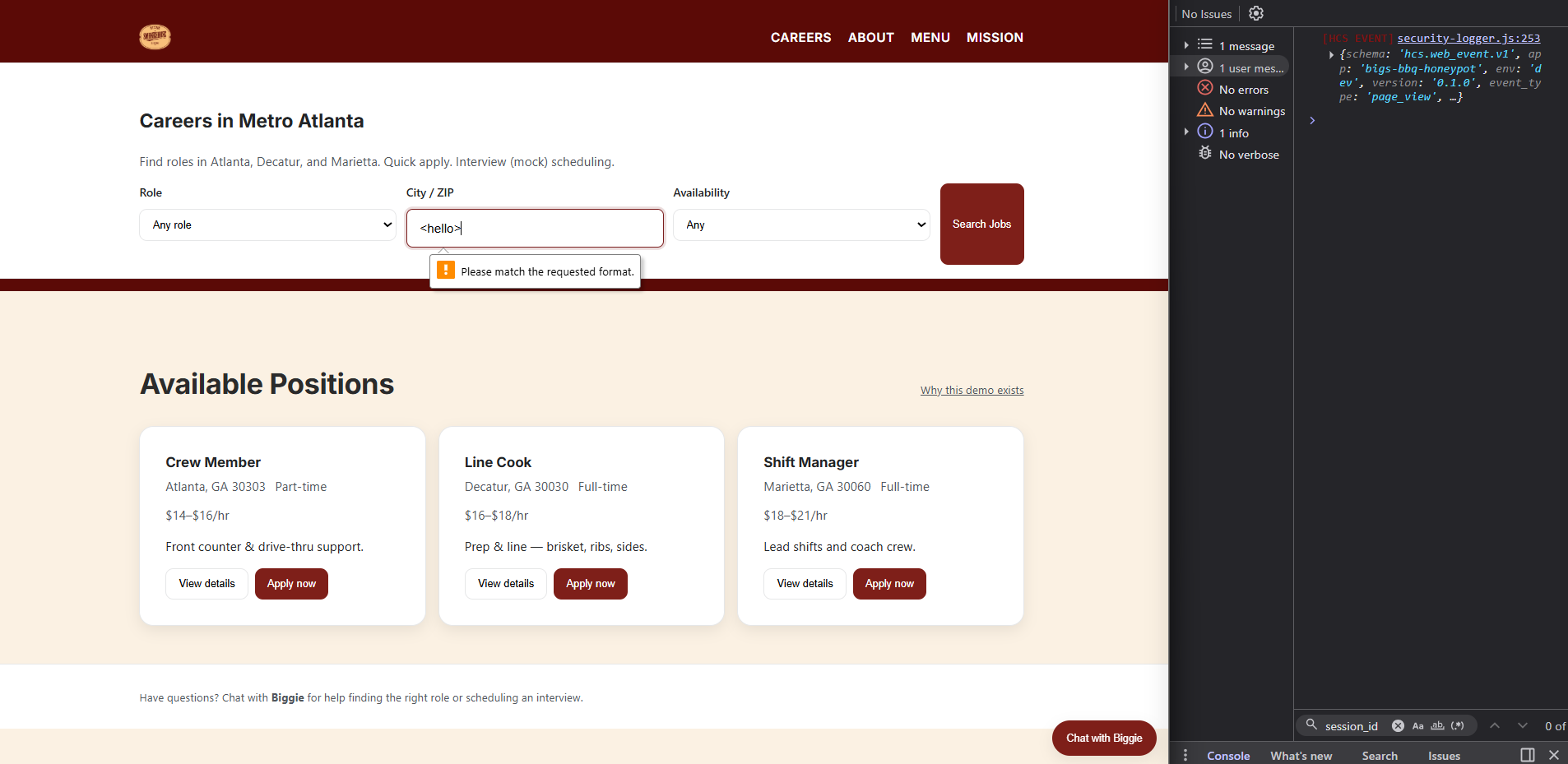 To address this, I developed a fictional hiring platform for Big’s BBQ & Smokehouse and embedded custom client-side detection logic into every user input field. By simulating controlled attack scenarios—including SQL injection, XSS, and URL manipulation—I generated real-world telemetry that correlates disparate actions into a single session. This case study proves that web input fields can be treated as monitored attack surfaces, providing structured events that allow security teams to identify and hunt for early-stage attacker behavior