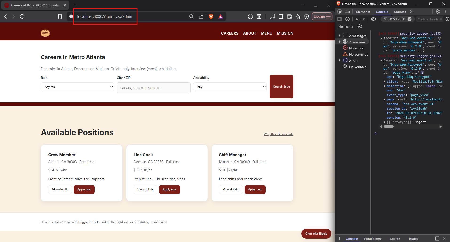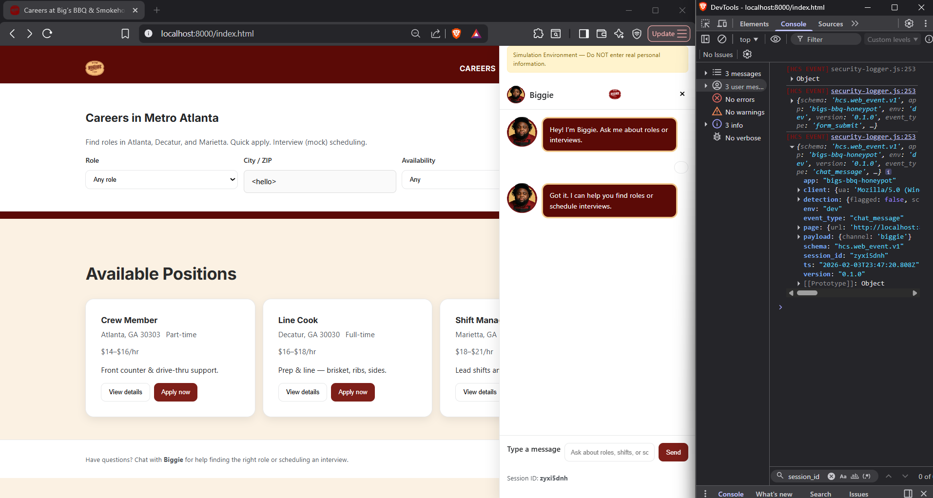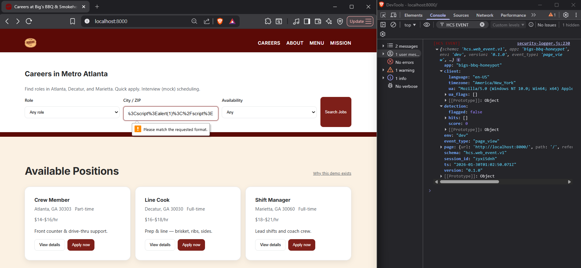 To address this, I developed a fictional hiring platform for Big’s BBQ & Smokehouse and embedded custom client-side detection logic into every user input field. By simulating controlled attack scenarios—including SQL injection, XSS, and URL manipulation—I generated real-world telemetry that correlates disparate actions into a single session. This case study proves that web input fields can be treated as monitored attack surfaces, providing structured events that allow security teams to identify and hunt for early-stage attacker behavior